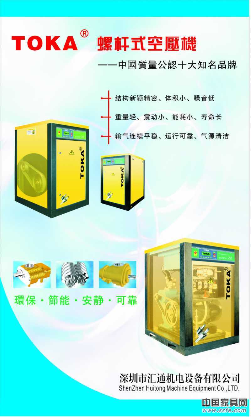 公司設(shè)計、銷售的主要產(chǎn)品有:TOKA®(特高)牌螺桿式空壓機(jī)、活塞式空壓機(jī)、儲氣罐、冷凍式干燥機(jī)、吸附式干燥機(jī)、過濾器等設(shè)備;設(shè)計制造:車間水簾負(fù)壓降溫工程、不燒油不燒電的企業(yè)熱水工程。TOKA®牌空壓機(jī)被評為2007年中國質(zhì)量公認(rèn)十大知名品牌。