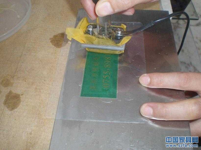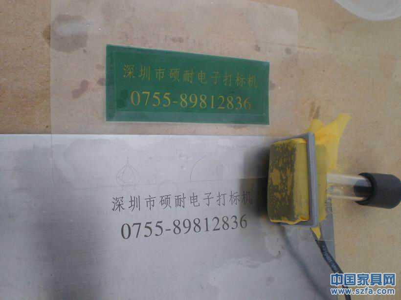 打標(biāo)方法: 把要打印的內(nèi)容制在膜版上(大批量制絲網(wǎng)膜版,小批量可打印蠟紙膜版),然后把膜版放在要打印的工件上,將機(jī)器的輸出電極粘(打標(biāo)頭)取少量打標(biāo)液,壓在工件上面1-2秒即可,移開(kāi)電極、膜版,一件精美的標(biāo)識(shí)即打印出來(lái)了,永不脫落。 操作圖片: