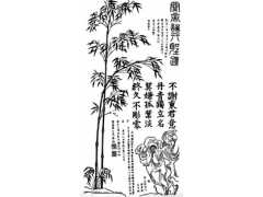 傳統(tǒng)武強(qiáng)年畫,以字蘊(yùn)于竹形中,成詩(shī)文。出自三國(guó)故事,劉備被曹操所敗而關(guān)公被俘。極受優(yōu)禮并封為漢壽寧侯。關(guān)公并沒(méi)動(dòng)搖之意。于是畫了一張墨竹藏詩(shī)圖(詩(shī)曰:不謝東君意,丹青獨(dú)立名。莫嫌孤葉淡,終久不凋零。)于劉備以表忠義之情。“關(guān)公”即三國(guó)名將“關(guān)羽”,為國(guó)捐軀。因其忠義,后來(lái)幾代皇帝都封其為關(guān)帝圣君,被人們奉為萬(wàn)能神,佛教奉其為“護(hù)法神”。