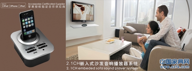 我司(佛山市順德大良威名電器有限公司)設(shè)計生產(chǎn)的2.1CH嵌入式沙發(fā)音響放器系統(tǒng),用戶可將它嵌入沙發(fā)中,安裝方便快捷,是沙發(fā)也是ipod/ipad/iphone音響,我司是直接蘋果公司授權(quán)的指定合作供應(yīng)商,內(nèi)置了直接蘋果公司授權(quán)的無線視頻解碼器功能,通過2.4G高清無線視頻輸出,讓嵌入沙發(fā)音響播放器與電視機同步演繹,視頻高清流暢,品質(zhì)卓越,音質(zhì)純正優(yōu)美。讓用戶在家也可以享受到頂級的視聽盛宴。