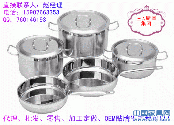 高檔不銹鋼廚具、湯鍋、炒鍋、煎鍋、奶鍋、刀叉、碗筷碟子等眾多款式,批發(fā)、零售代理還可以加工定做,OEM貼牌生產(chǎn)!廠家直銷?。?!櫥柜、炊具等產(chǎn)品配套的最佳選擇!消費者最愛的禮品,贈品!