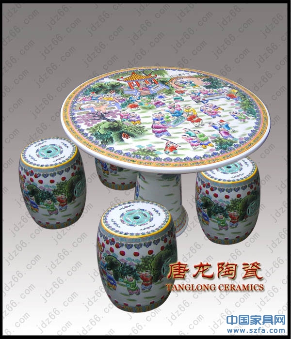 景德鎮(zhèn)陶瓷桌凳具有不怕風吹雨打,歷久如新,易清潔等特點。是家居使用、園林擺設(shè)、饋贈親友的時尚用品。放置在庭院、露臺、陽臺雅致高貴。本公司完全采用景德鎮(zhèn)傳統(tǒng)手工陶瓷制作工藝制作。圓桌面、方桌面,青花、粉彩、墨彩等畫面齊全,款式多樣。(出廠價供貨,價格最優(yōu)!)