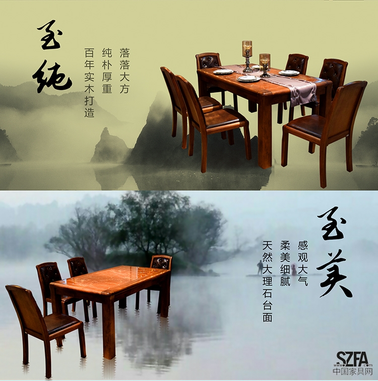 博豐家具中式具天然大理石臺(tái)面紫金梨木實(shí)木餐桌餐桌椅 頭層真皮