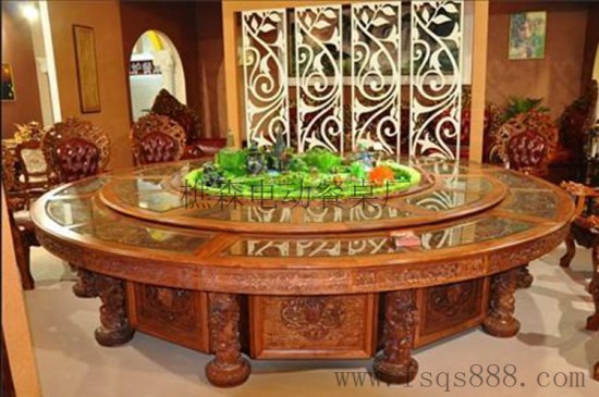 【功能介紹】:電動功能,即桌子的轉(zhuǎn)盤是在電動機(jī)的驅(qū)動下進(jìn)行旋轉(zhuǎn),轉(zhuǎn)速可調(diào),方便用餐人員,夾取食物菜肴,遙控器控制或手動開關(guān)控制旋轉(zhuǎn);另可增設(shè)旋轉(zhuǎn)式電磁爐、電動音樂噴泉等功能。免費配有2個遠(yuǎn)程遙控器,方便侍者服侍。中間放置山水噴泉景觀,水流在滾運石的旋轉(zhuǎn)下飛濺,池中可放置五彩石和金魚,另外可打開音樂功能,增加別樣用餐氛圍。