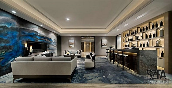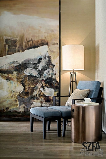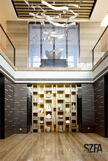 建筑與藝術(shù)作品相結(jié)合,可以得到精神上的升華,以至成為一種文化的象征。步入玄關(guān),淡金色的案幾雕塑與天圓地方的抽象造型寓意和諧與完滿。挑高逾六米的客廳以紋理豐富的藍貝魯大理石飾墻,更宛若徐徐展開的水墨畫卷,清雅寫意。