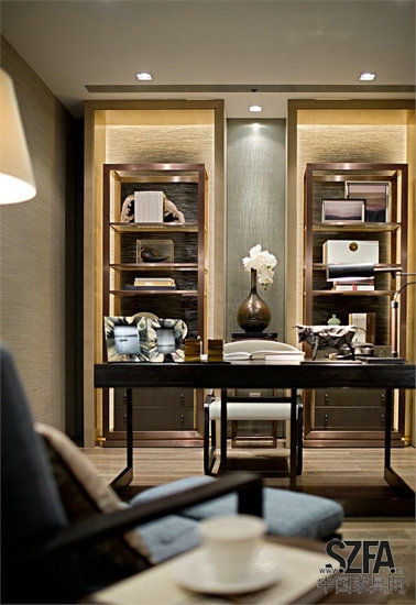 主人套房內(nèi)設(shè)書房,選用藍色銀絲底布及鏡底夾絲玻璃,配襯古銅色和深色捫皮組成的書架,營造雋逸爾雅的書香氛圍。