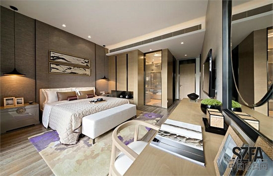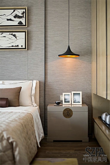 其他睡房皆以溫馨雅致為空間主題,水墨油畫的墻面主題與粗糙肌理的飾品相搭配,于沉穩(wěn)中煥發(fā)和諧自然的氣氛;時尚前衛(wèi)的家具又為空間提升了無限靈動。