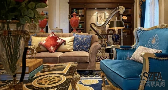 位于一層的客廳會客區(qū)以寶石藍色系為主,在西方宗教傳統(tǒng)中寶石藍是皇族與貴族鐘愛的顏色,迷人而優(yōu)雅,處處彰顯貴族的氣息。
