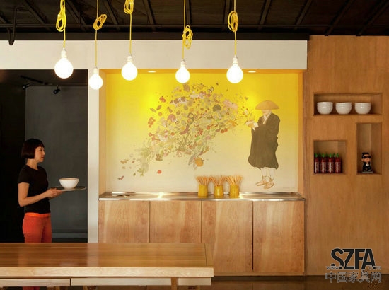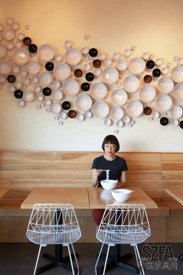 設(shè)計結(jié)合了工業(yè)材料和更有表現(xiàn)力的成品,像手工木質(zhì)家具和瓷磚。 Fleetwood Fernandez也設(shè)計了許多蜜胺碗的有機裝置,它們位于長椅休息區(qū)的上方,并代表餐廳的焦點。