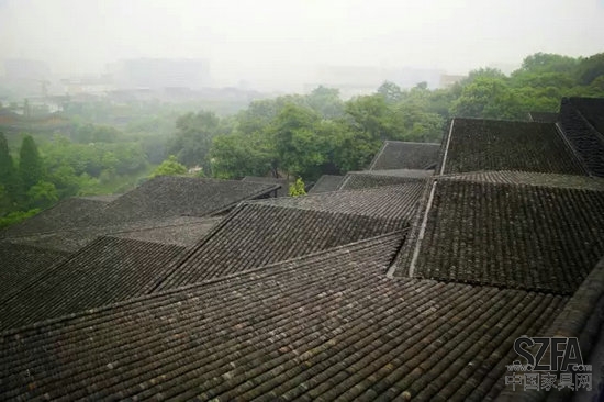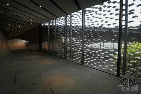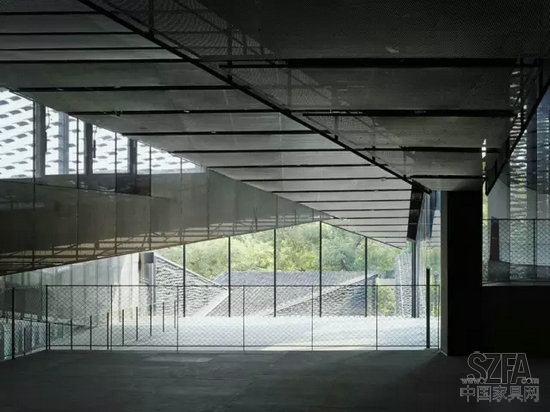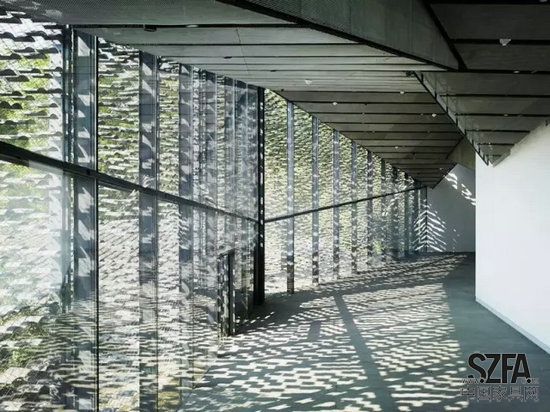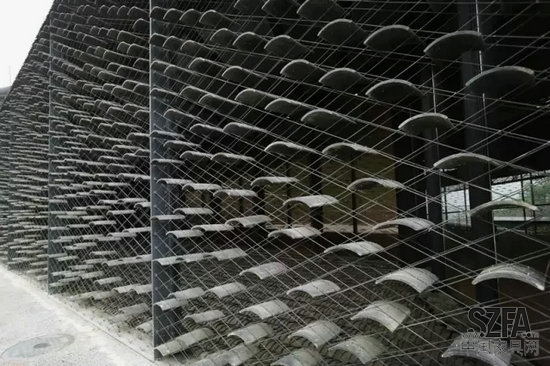建筑結(jié)構(gòu)與景觀無(wú)縫接合,菱形屋頂相互交織,讓這座建筑看上去就像一片樸素而精致的江南小村莊。這里最使人印象深刻的元素是瓦,除了屋頂大面積使用瓦片,其外墻也由瓦片構(gòu)建而成。無(wú)數(shù)塊瓦片以不銹鋼鋼絲串聯(lián),形成了獨(dú)特的建筑外墻景觀。