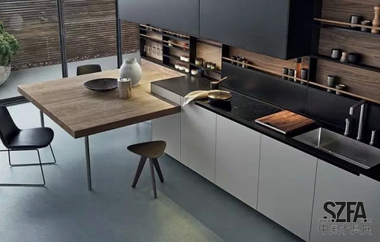 結(jié)構(gòu)緊密整合的廚房設(shè)計(jì),將工作組合臺(tái)、工具收納柜和廚房電器巧妙結(jié)合在一起,能創(chuàng)造一個(gè)真正親切沒(méi)有距離感的廚房天地。
