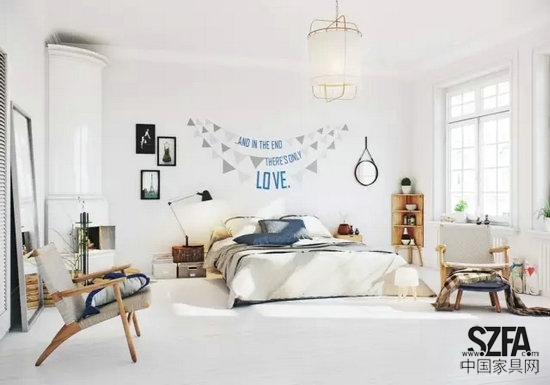 墻壁上大大的“Love”字樣讓人覺得暖心,舒適的沙發(fā)椅、床邊的整理箱和角落的擺件都讓臥室顯得隨意休閑。并不顯眼的壁爐足夠溫暖,木材整齊地堆砌在地上,增加了濃郁的生活氣息。