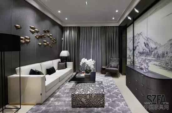 各種精致細(xì)節(jié),不同質(zhì)感的紡織品,典雅深厚的色彩,無一不為這深邃的空間綻放它的美。更是令人驚嘆的是設(shè)計(jì)師選用了元代畫家黃公望的《富春山居圖》作為客廳的彩頭,絕妙之處便是層巒疊嶂之間放置了一尊晶瑩剔透的玉玲瓏,其意境深遠(yuǎn),無法言表。