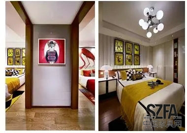 紅色和黃色兩個(gè)跳躍的色彩構(gòu)成了兒童房的主色調(diào),樓梯間的狗狗肖像圖充滿童趣。些許龐克氣息的黃色房間,個(gè)性調(diào)皮。另一個(gè)房間里,紅色丹頂鶴的壁畫優(yōu)雅而亮麗,不失高貴氣息。