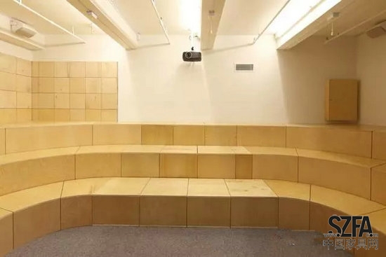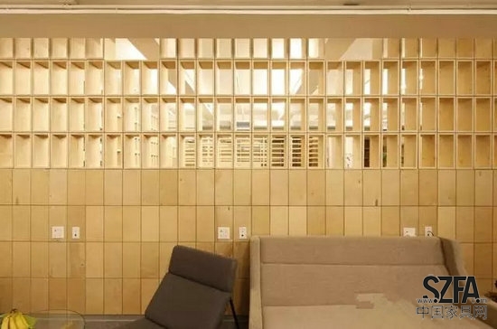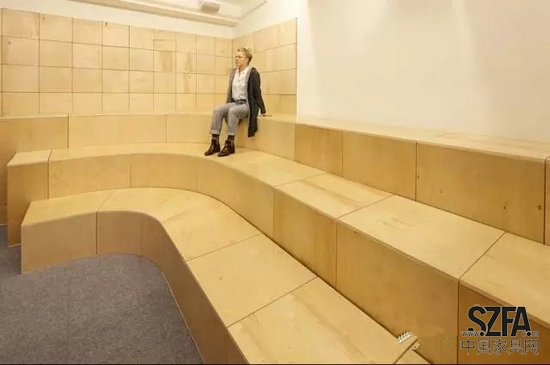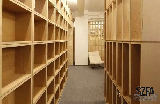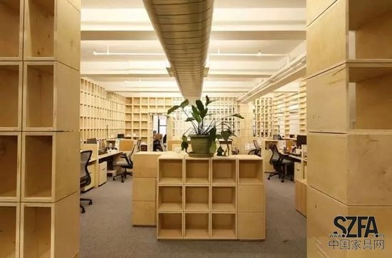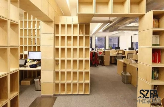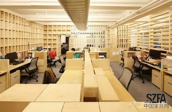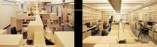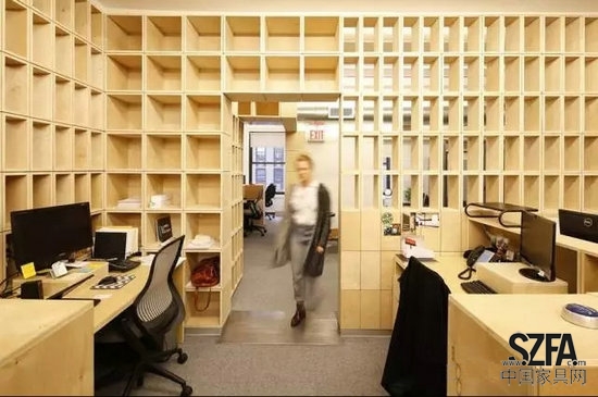 Taylor and Miller為他們開發(fā)了辦公室隔墻和家具系統(tǒng),都是由不同尺寸和直線形狀的基本膠合板箱做成的。由多個隨機(jī)的方式安排的盒子組成了隔墻,這樣就允許了空間中的視覺連通性,當(dāng)移動到新的空間后,原來的盒子被重新組織,用了單一的盒子形狀來搭建整面隔墻。對于設(shè)計師來說,這個想法是:隨著辦公室的擴(kuò)展,在新的空間里增加了更多的勞動力,在人口密度增加和任務(wù)有重疊的情況下,辦公有一定程度的紊亂,該建筑體系的設(shè)計,將抵消這一混亂走向;盒子的重復(fù)性和紋理將這個工作間與下一個工作間分開,給員工提供了一個安靜的空間和隱私分層。