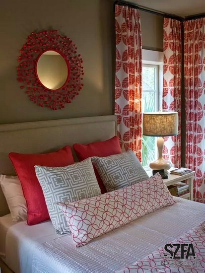 這里,中國紅出現(xiàn)在臥室色彩上。紅色跟黑色是常見的搭配色,為了緩和兩種濃重色彩帶來的壓抑感,適當?shù)陌咨珌碜鰹橹虚g的調(diào)和色。