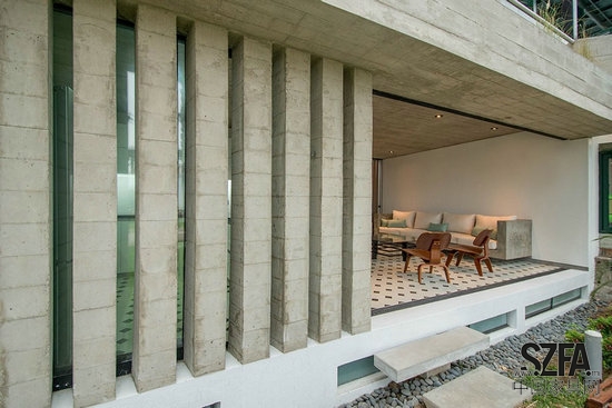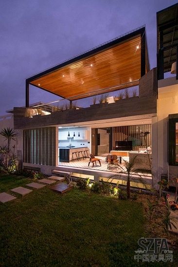 樓前區(qū)域作為進(jìn)入私人臥室區(qū)和二樓露臺(tái)的前奏。在露臺(tái)區(qū)域,朝向前面的部分、開(kāi)放式客廳和主餐廳使得視野靠近街道立面。在樓的背面,泳池和燒烤區(qū)位于陽(yáng)臺(tái)旁更私密的位置,可以欣賞大海和周?chē)h(huán)境。