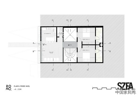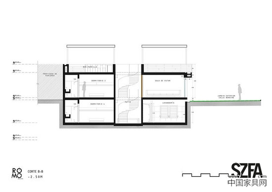 過(guò)梁強(qiáng)調(diào)了入口空間,并且支撐起有頂?shù)目臻g框架:如客廳、廚房和客衛(wèi)?;炷粮駯藕湍静挠米骶彌_,來(lái)給房屋提供不同程度的相對(duì)街道的私密。