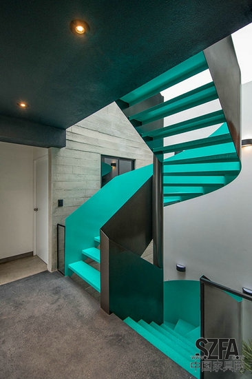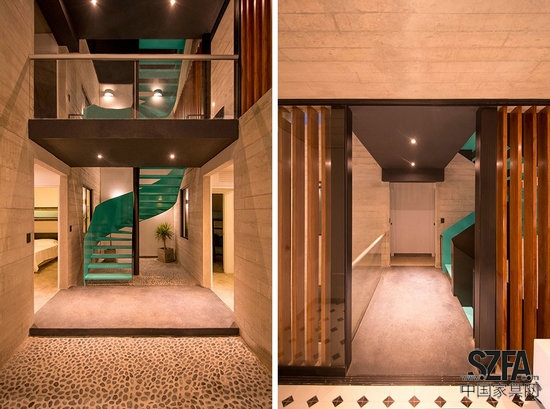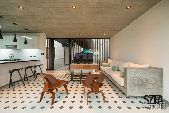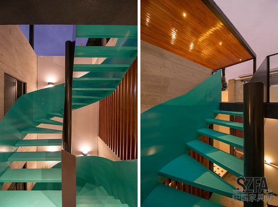 使用的材料有露石混凝土、拋光混凝土、水磨石和馬賽克,力圖將房屋裝飾成半鄉(xiāng)村的氛圍,突出一些對(duì)比的元素,如樓梯、木工及家具,這些元素給房屋設(shè)計(jì)帶來(lái)當(dāng)代特色。