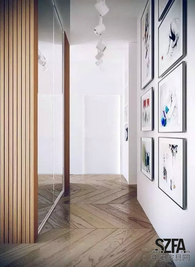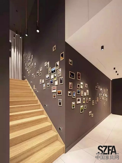 走廊和樓梯空間一般比較窄長,也是最適合掛畫的地方,三到四幅一組的組合畫或同類題材裝飾畫最好不過??筛叩湾e落,也可順勢懸掛。