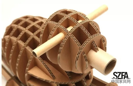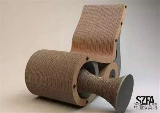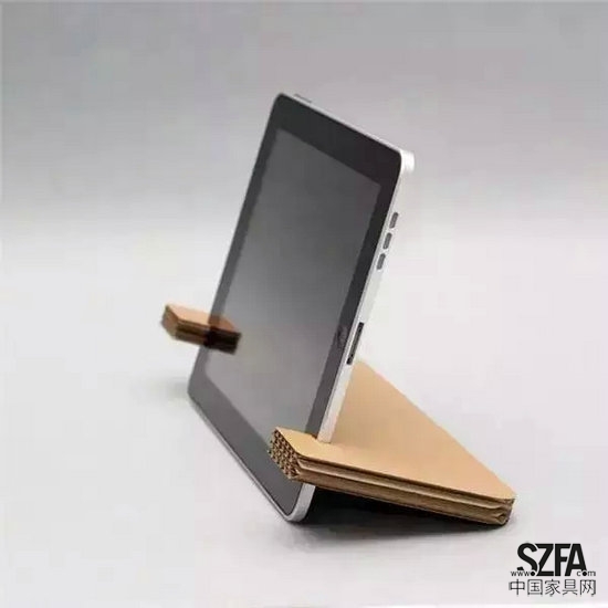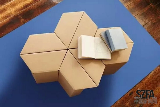 一把椅子,一個(gè)腳踏(兼具雜志架功能),一個(gè)茶幾,用多層瓦楞紙切割而成,拆卸、組合都非常方便,節(jié)省空間。
