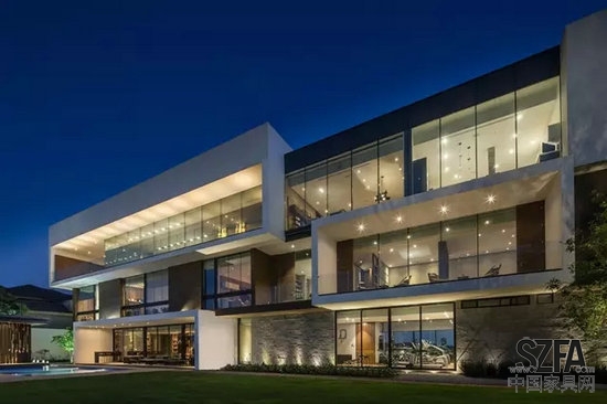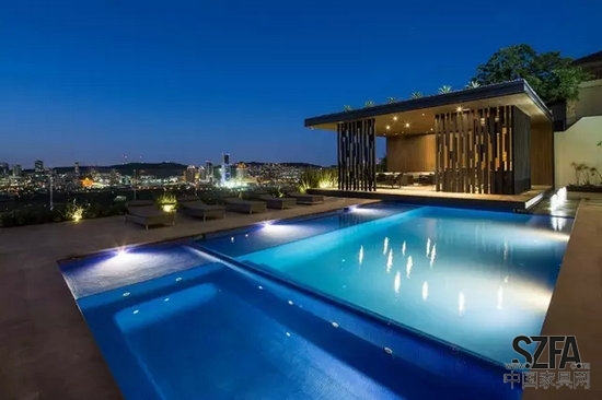 在房屋的最頂層,有一些社交活動區(qū)域。中間層主要功能則為起居生活,有一間大主臥,以及四個供孩子們和客人使用的寬敞房間。在房子的底層則為娛樂區(qū),泳池酒吧應(yīng)有盡有。