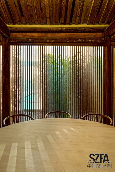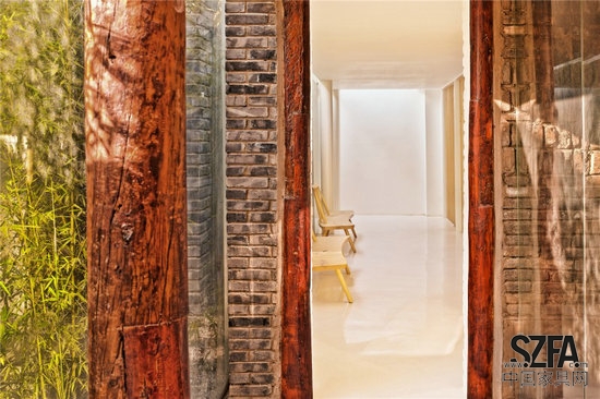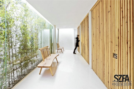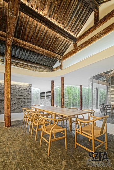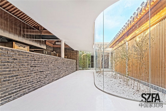 在傳統(tǒng)建筑中,廊是一種半內(nèi)半外的空間形式,它的曲折多變、高低錯落,大大增加了游園的樂趣。猶如樹枝分岔的曲廊從室外伸展到舊建筑內(nèi)部,模糊了院與房的邊界,改變院子呆板狹窄的印象。輕盈、透明、純白的廊空間與厚重、滄桑、灰暗的舊建筑形成氣質(zhì)上的反差,新的更新、老的更老,拉開時間上的層疊,新與舊相互產(chǎn)生對話。曲廊在原有院子中劃分了三個錯落的弧形小院,使每一個茶室有獨立的室外景致,在公共和私密之間產(chǎn)生過渡。曲廊的玻璃幕墻好似一個懸浮地面之上的弧形屏幕,將竹林景觀和舊建筑形式投射到茶室之中,新與舊的影像相互疊加。曲廊同時具有舊建筑的結(jié)構(gòu)作用,廊的鋼結(jié)構(gòu)梁柱替換了局部舊建筑中腐朽的木材,使新與舊“長”在了一起。