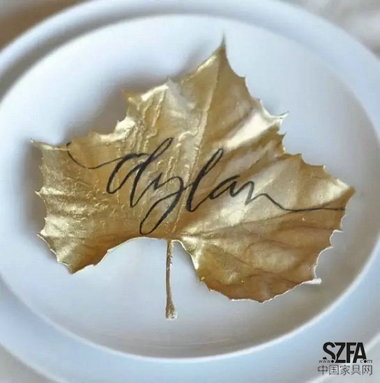 楓葉上寫上賓客的名字放在餐盤里,都很應(yīng)景。