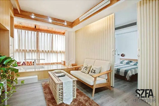 小戶型雙人沙發(fā)背后,便是開放式臥室,當(dāng)折疊門打開時(shí),主人可以很方便地在床上觀看影片。來客時(shí),折疊門一關(guān),臥室風(fēng)光自然遮掩不可見了。