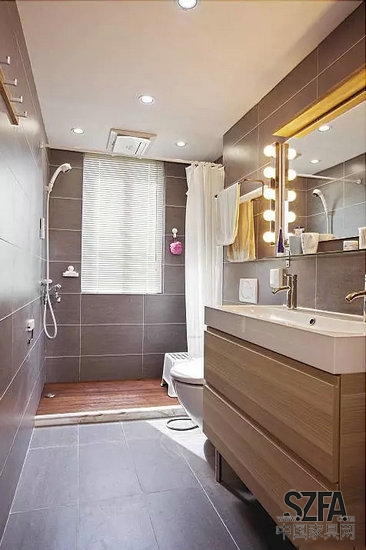 這個(gè)衛(wèi)生間用上灰棕色的防水墻磚,配上木質(zhì)衛(wèi)浴柜,簡單的配搭卻展現(xiàn)出高雅的品位。