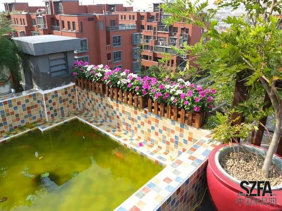 花園里用馬賽克鋪設(shè)出一個(gè)小水池,養(yǎng)些金魚可以陶冶情操