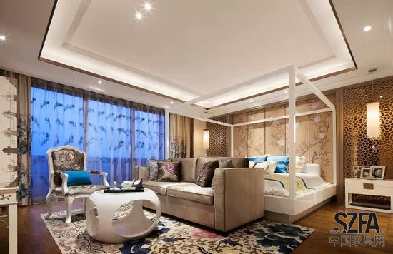 臥室則以清雅做基調(diào),運用了花的顏色與鳥的圖案。這是古人喜愛的祥和圖案,是一種婉轉(zhuǎn)的向往,設(shè)計師借用美好的愿景添置在臥室內(nèi),令東方文化無處存在。