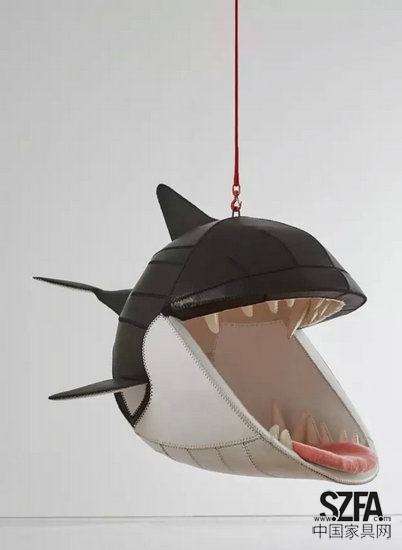 南非的設(shè)計(jì)師 Porky Hefer 在邁阿密設(shè)計(jì)周展出了它的椅子 Fiona Blackfish,一個(gè)張開了嘴的鯊魚頭。鯊魚頭用黑色和白色的皮料拼接,兩側(cè)有魚鰭,后面還背了一個(gè)縮小的尾巴,看起來(lái)非??蓯?。嘴中露出了皮質(zhì)的白牙和粉色的舌頭,舌頭也是一個(gè)絨毛墊,可以讓人們坐著或躺在里面。