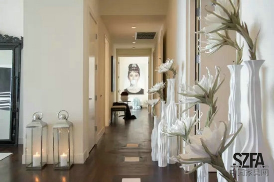 還有其他裝飾品點亮了整個空間,主人房放置兩盞吹制玻璃臺燈,Melrose Gallery的支型吊燈,Baker意大利制造的水晶球地燈。