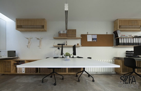 相對(duì)于庭院老樹的牢固穩(wěn)重,我們把室內(nèi)空間設(shè)計(jì)得相對(duì)輕盈靈活。在工作區(qū)的桌子從墻壁懸桁,創(chuàng)造了一個(gè)全架空的桌下空間。繼而,電腦的主機(jī)隱藏到靠墻的儲(chǔ)藏架里,這難得的通暢不止增加這小小辦公室的舒適,更為小狗們提供了嬉戲或午睡的好地方。