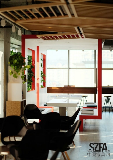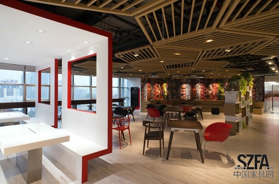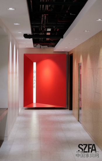 位于九層的OCafé辦公區(qū)以?shī)W美的標(biāo)志紅色為基礎(chǔ),明亮的色彩令員工充滿激情創(chuàng)意的個(gè)性彰顯無(wú)疑。