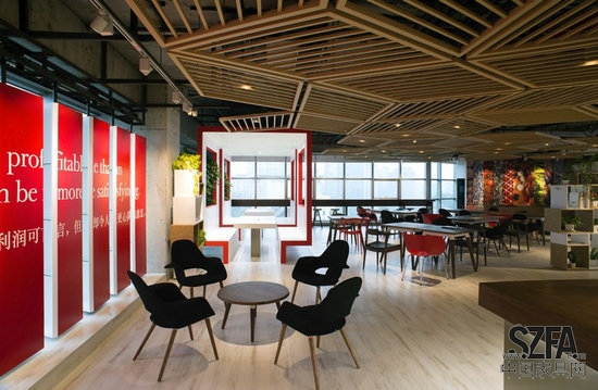 “我是屬于年輕人的,這個(gè)辦公空間專為年輕一代設(shè)計(jì),他們崇尚不羈的自由,喜歡喝咖啡,所以我就把咖啡館引進(jìn)室內(nèi)。員工沒有固定工位,想在那里辦公都可以。但我們不是星巴克,是奧美,這里必須有奧美的特色,有中國(guó)的特色。” 奧美公司大中華區(qū)首席執(zhí)行官莊淑芬女士說(shuō)。