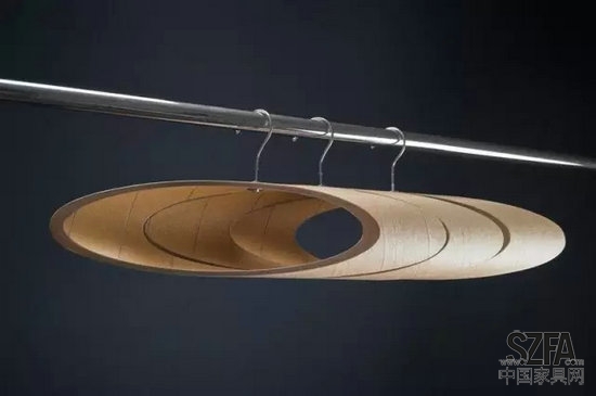 這組衣架是圓環(huán)結(jié)構(gòu),細(xì)看時(shí)可以發(fā)現(xiàn)衣架表面微妙的旋轉(zhuǎn)。烏克蘭的設(shè)計(jì)師 Viktor Puzur 從回收的圓筒紙板上斜向切割,形成了這些圓環(huán),在上面鉆孔安裝金屬掛鉤后做成一個(gè)衣架。衣架有一個(gè)流動(dòng)的弧度,可以直接懸掛圍巾或首飾,與飾品相互搭配,一起成為裝飾。