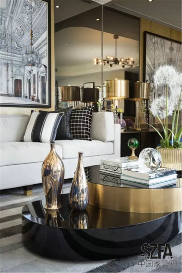 客廳以簡潔示人,簡練直挺而富有生命悅動感的迷人線條,舒適而奢華的面料,黑與白締造的經典,香檳色柔和魅惑。