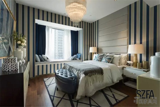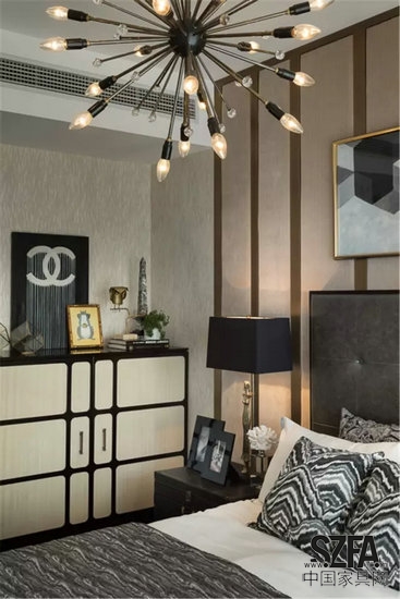 次主臥直簡的線條顯現出深沉的寂靜,挺括順滑的面料,擯棄繁雜瑣碎的負重,幾何線條和抽象畫再次延伸,純真且浪漫。
