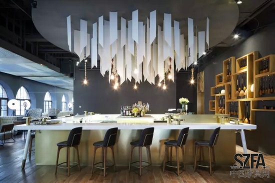 吧臺(tái)區(qū)域選擇亞洲傳統(tǒng)書(shū)法元素來(lái)點(diǎn)題。宣紙被裁剪成一條條斜邊紙條,從木制天頂優(yōu)美地垂落,幾條木吊燈配合氣場(chǎng)十足的黃銅吧臺(tái)桌,縱向?qū)用媪Ⅲw豐富。