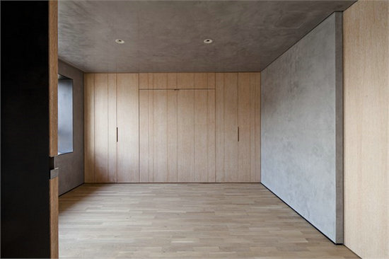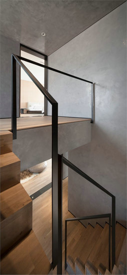 極具肌理感的灰色水泥漆結(jié)合硬朗的扶手欄桿使空間有很強(qiáng)的現(xiàn)代感,樓梯踏步的木本色又將水泥色的冷度拉回一定的平衡,空間與材料之間的銜接細(xì)節(jié)也相應(yīng)體現(xiàn)。