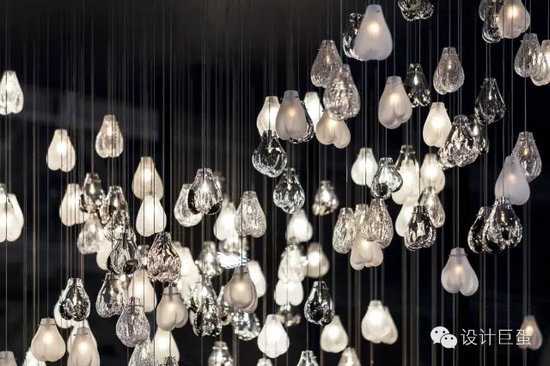 透明玻璃、磨砂玻璃和半透明乳白色玻璃的不同結(jié)構(gòu)單色體系和垂飾上的手繪黃金色塊增強了作品的變奏。為雕塑增加動態(tài)元素,設(shè)計師編程了一種柔軟、流動的浮動的照明擺動,類似花朵在原野里的擺動或星星的閃爍。