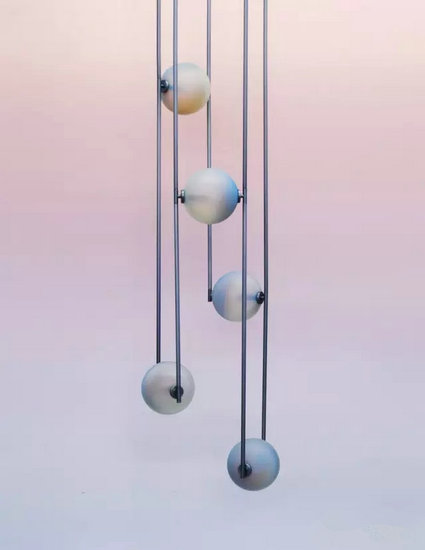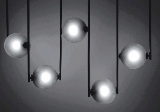 美國工作室 Ladies & Gentlemen 設計的一系列玻璃球形吊燈,開燈時能夠變換顏色。設計師Hogan說,“所有的玻璃燈表面還用特別的噴砂處理,給了燈的表面增加了特殊的光澤,當然還可以變色。”