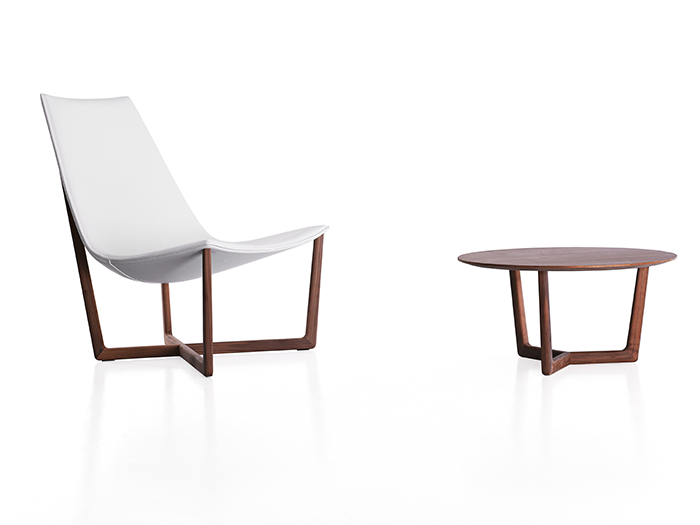 Harmonious lines and relaxed posture distinguish the Jade lounge armchair: presented by Porro in leather or eco-leather, it appears to be suspended on a black stained ash structure or Canaletto walnut structure with cross base, supported at four points. The Shahan table, ideal complement to the Jade armchair, recalls it in its finishes and crossed wood supporting structure with, however, a circular top.