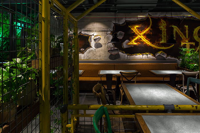 店址位于負(fù)一樓,沒有自然采光,層高比較有局限性,為了能實現(xiàn)“城市綠洲”這個主題概念,我們的設(shè)計師將餐廳的門頭入口處打造成了一個戶外花園的調(diào)性,抬高門口,就餐者在進(jìn)入餐廳的那一刻可以放慢了腳步,走進(jìn)一個慢時光里來,享受空間的趣味性和層次感,錯落有致的綠植,營造出花園里輕松舒適的氛圍,在這里,時光被稀釋了,腳步放慢了,心中的缺失感被填滿了,憂心事忘懷了,給自己一個獨特的空間。