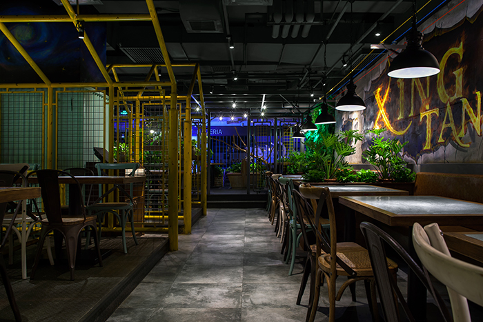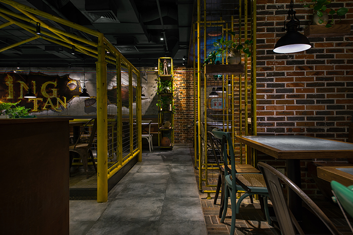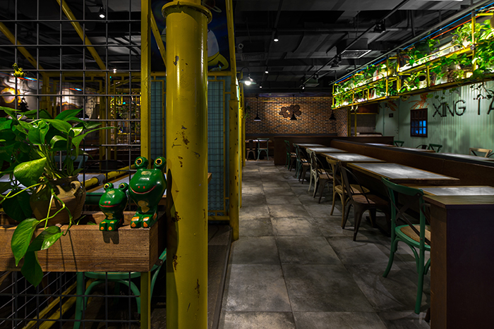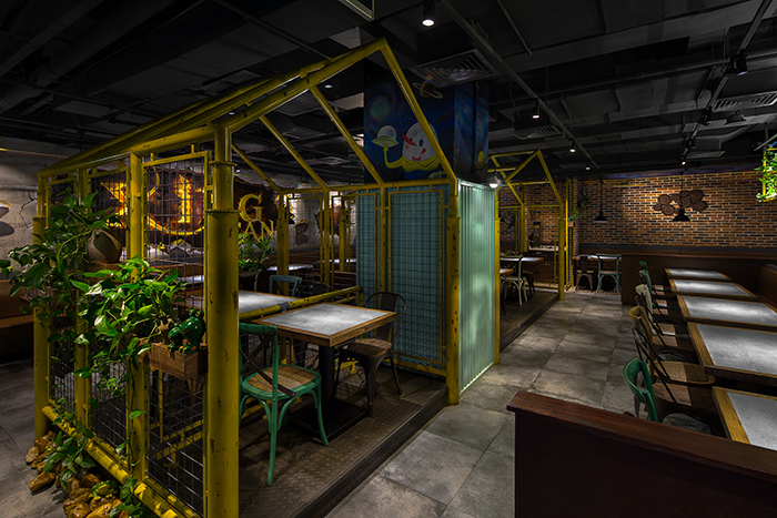 本案位于深圳東門茂業(yè)百貨商場,星炭鍋鍋香主要以提供美味的烤魚為主,而在餐飲業(yè)如雨后春筍般崛起的今天,不得不面臨一種“越來越像”的整體趨勢,其中以工業(yè)風(fēng)為首要流行風(fēng)格??爵~餐廳幾乎全部以探魚爐魚為風(fēng)向標(biāo),以鐵通與花磚作為主材,使得其缺少品牌的識別性,淪為沒有個人風(fēng)格的相似產(chǎn)物。在本案中我們以打造一個“城市綠洲”來塑造一個全新的品牌形象,致力在這喧囂的都市中創(chuàng)造一份寧靜,為消費者打造一片遠(yuǎn)離忙碌的心靈棲息之所,給顧客一段舒適的自然時光。