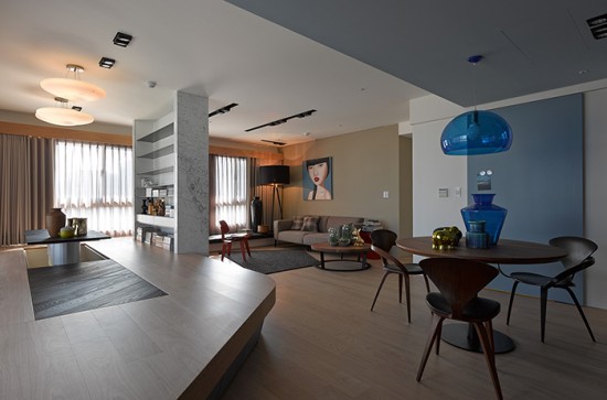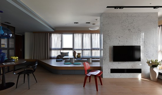 為了改善現(xiàn)代人普遍的“家庭式旅店”的生活習(xí)慣,設(shè)計(jì)師特別關(guān)注公共空間如餐廳客廳與聚會(huì)區(qū)的設(shè)計(jì),讓本來長時(shí)間待在家的兩個(gè)女兒能多花點(diǎn)時(shí)間與家人共處。因此,將原有的靠客廳的房間打掉,改造成用餐區(qū),并藉以擴(kuò)大公共區(qū)域面積??蛷d區(qū)與架高區(qū)相鄰,讓有不同需求的使用者仍然能在同一大范圍內(nèi)進(jìn)行各自的工作或是休閑活動(dòng)。此外,動(dòng)線方面,設(shè)計(jì)師將公共空間拉出置中,環(huán)繞項(xiàng)目''共同生活''的主旨。架高區(qū)跟客廳區(qū)的回字型行動(dòng)線設(shè)計(jì)讓用戶能更自由的穿梭與溝通。