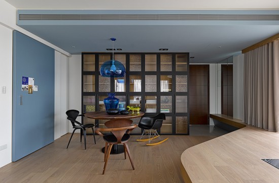 第二主墻位于餐廳區(qū),屋主希望能有收納兼展示的功能,因此立面設(shè)計(jì)須兼具玻璃展示柜與收納柜。而采用不同的玻璃就能同時(shí)打造半穿透與全透明的視覺效果。此外,藉由整齊的格子整合整體視覺,而各種紋理的玻璃則豐富了柜體立面;軟裝部分在選用圓形餐桌,吊燈來軟化方格柜體的效果。讓主墻(電視墻)與次主墻(餐廳櫥柜)的配搭做成色系對(duì)比。