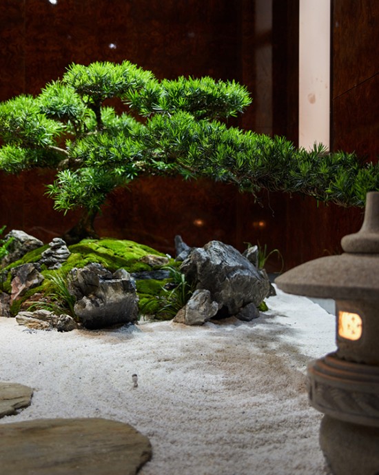 設(shè)計之初,印象空間就設(shè)想把自然景觀融入營銷中心,與周邊環(huán)境相呼應(yīng),拉近人與空間的距離。在現(xiàn)場施工條件有限的前提下,綜合各種因素的考量,最終以景觀軟裝來呈現(xiàn)。一體成型的景觀軟裝擁有成熟的模擬系統(tǒng),可控的土壤溫度、澆灌循環(huán)等維持著生態(tài)蓬勃,無論是呈現(xiàn)效果,還是后期維護,都無可挑剔。